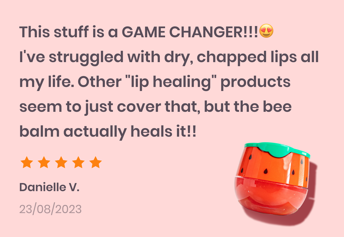 I’ve been struggling with dark, dry, and cracked lips for years, nothing worked until Bee balm. Now, my lips are smooth, even-toned, and smell amazing!!